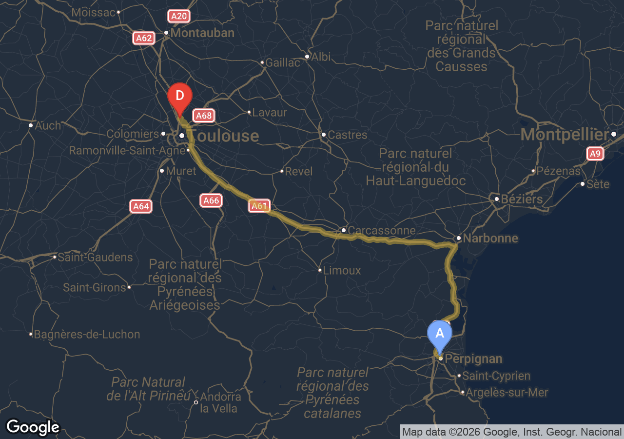 Trajets importants (Bordeaux, Carcassonne, Narbonne, Andorre...).