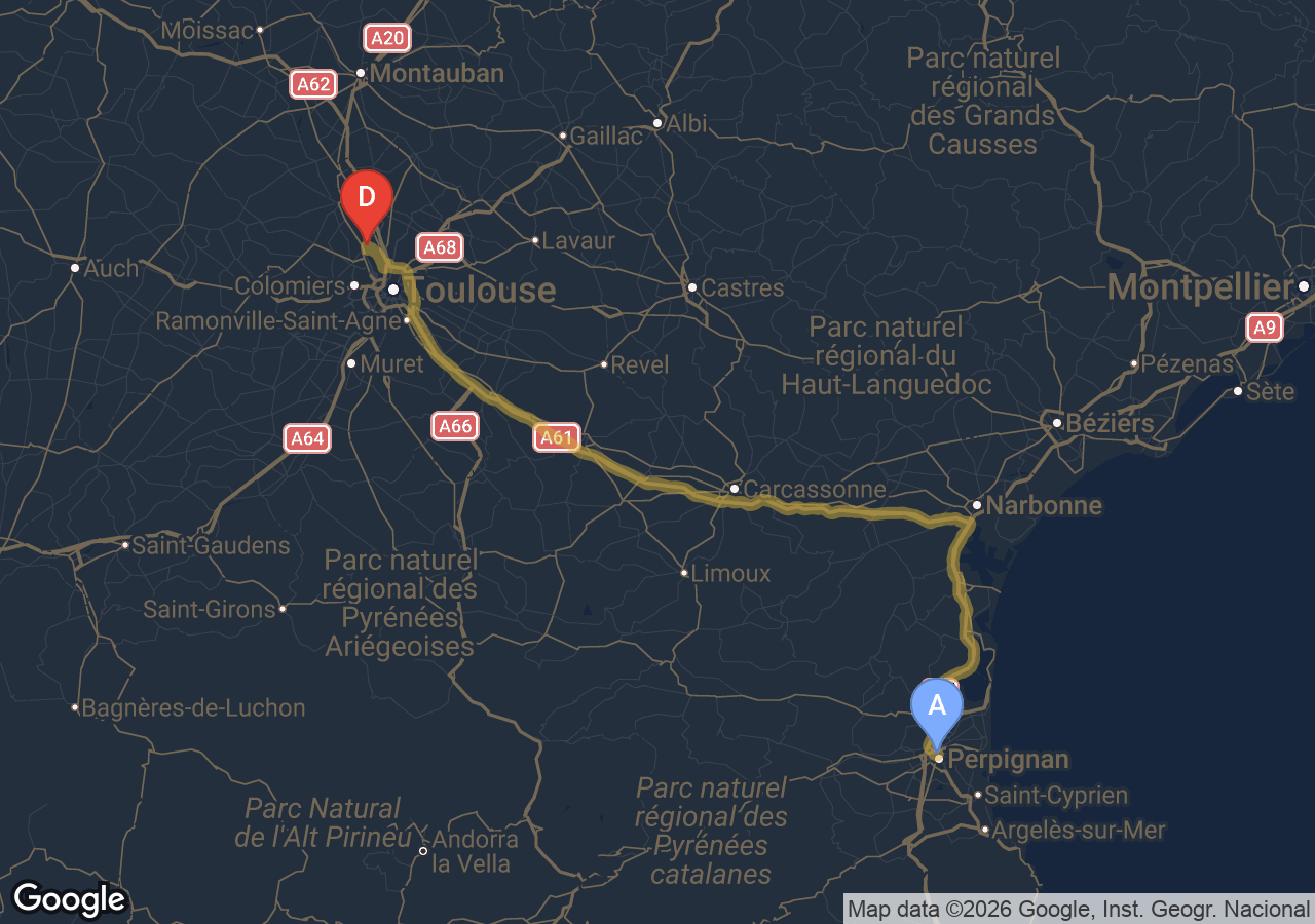 Trajets importants (Bordeaux, Carcassonne, Narbonne, Andorre...).