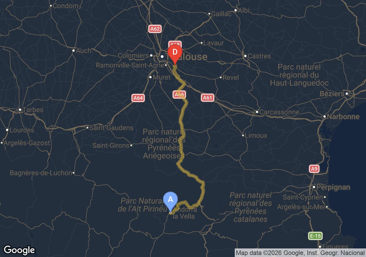 Trajets importants (Bordeaux, Carcassonne, Narbonne, Andorre...).