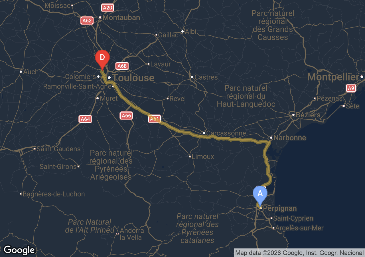 Estimé à 324 € TTC pour 190 km via la rocade, l'A61 et l'A9, péage A61/A9 inclus.