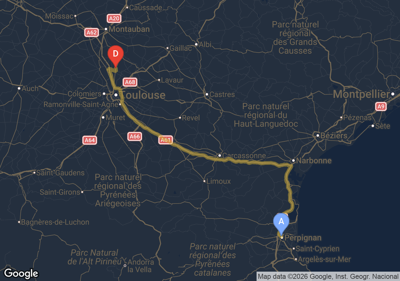 Estimé à 333 € TTC pour 195 km via la rocade, l'A61 et l'A9, péage A61/A9 inclus.