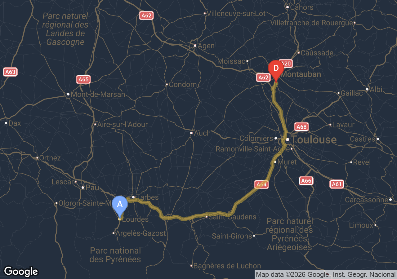 Trajets importants (Bordeaux, Carcassonne, Narbonne, Andorre...).