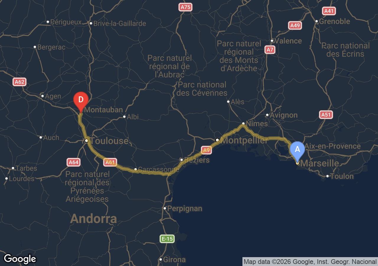 Trajets importants (Bordeaux, Carcassonne, Narbonne, Andorre...).