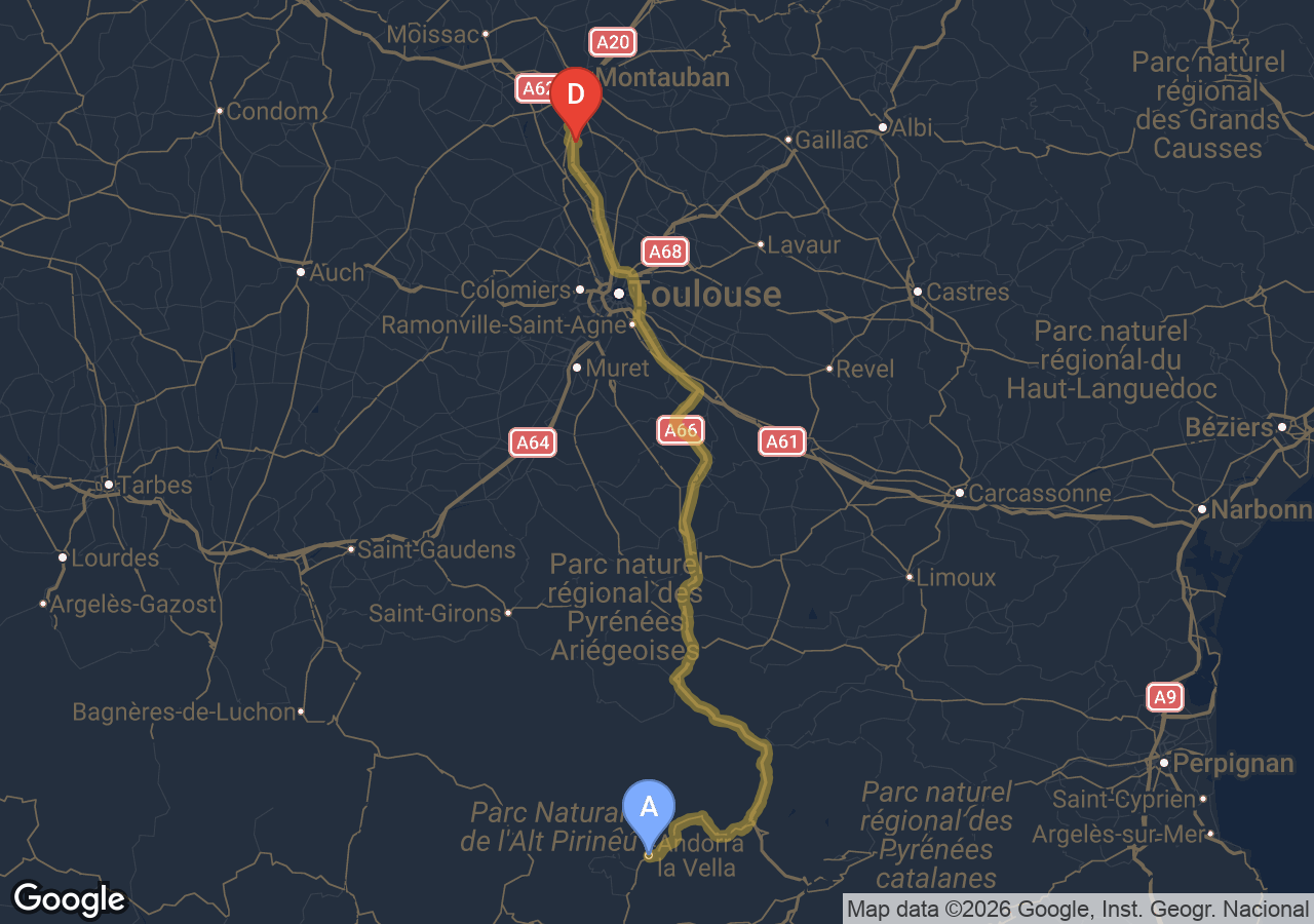 Le péage de l'A20 est inclus. La N20 (Ax-les-Thermes → Andorre) est gratuite.