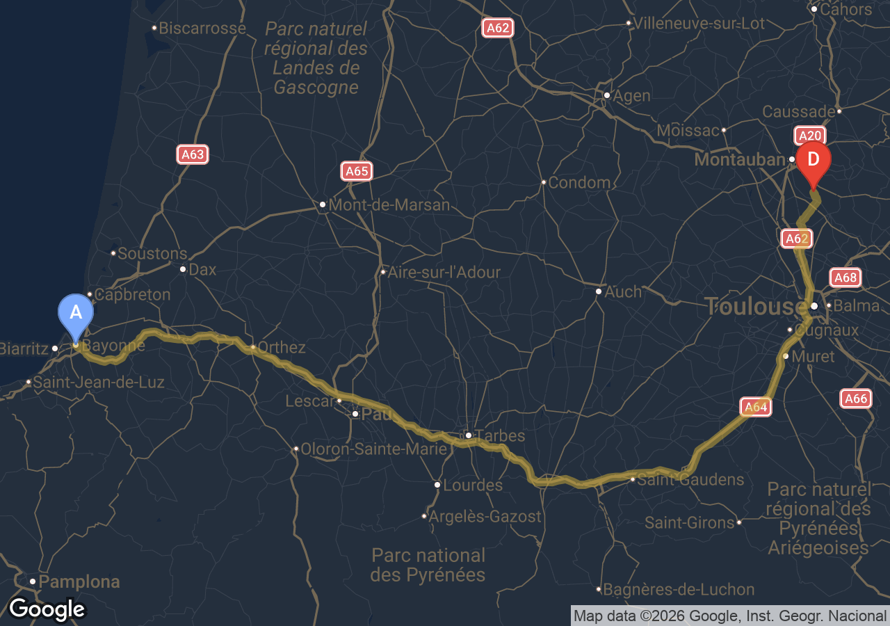 Trajets importants (Bordeaux, Carcassonne, Narbonne, Andorre...).