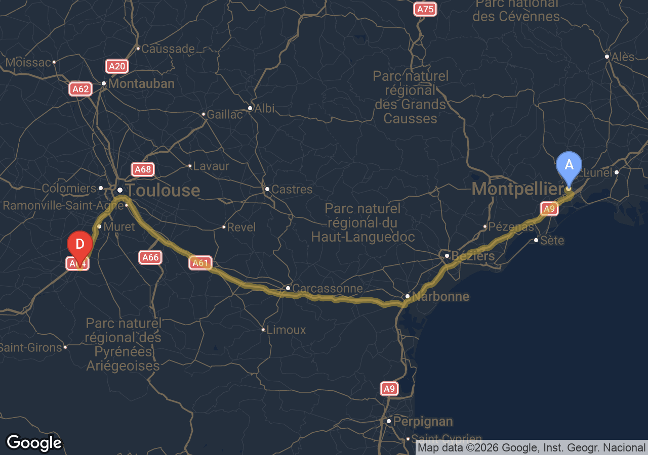 Estimé à 425 € TTC pour 250 km via la rocade, l'A61 et l'A9, péage A61/A9 inclus.