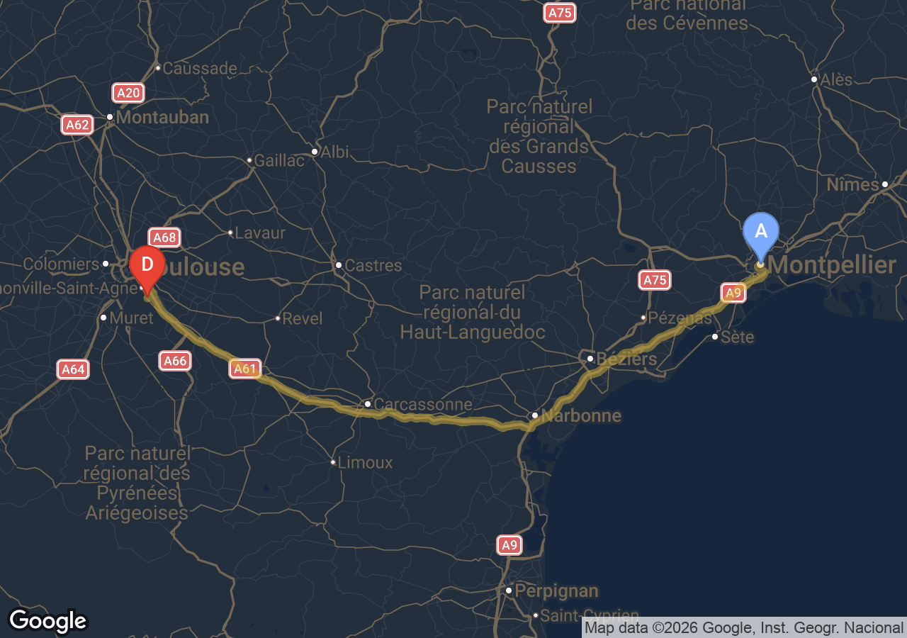 Trajets importants (Bordeaux, Carcassonne, Narbonne, Andorre...).