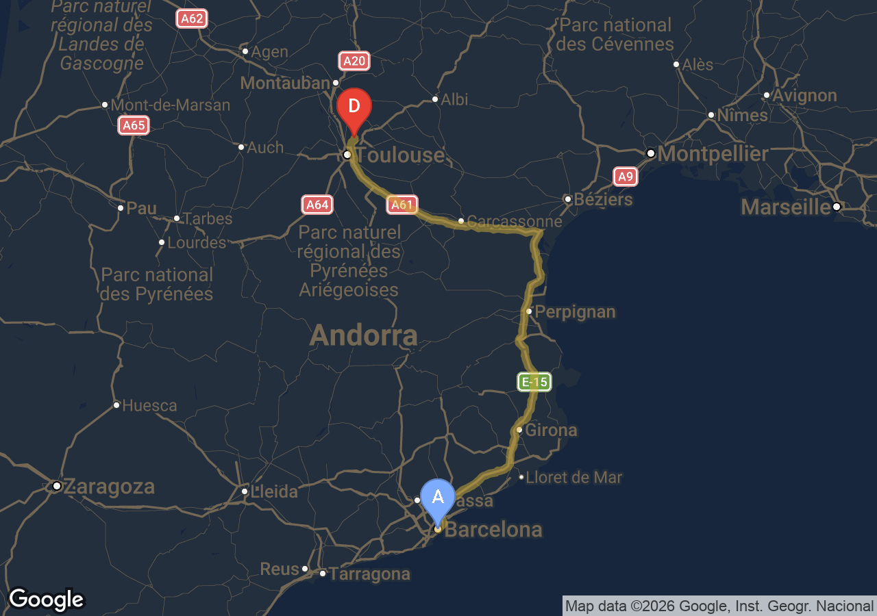 Trajets importants (Bordeaux, Carcassonne, Narbonne, Andorre...).