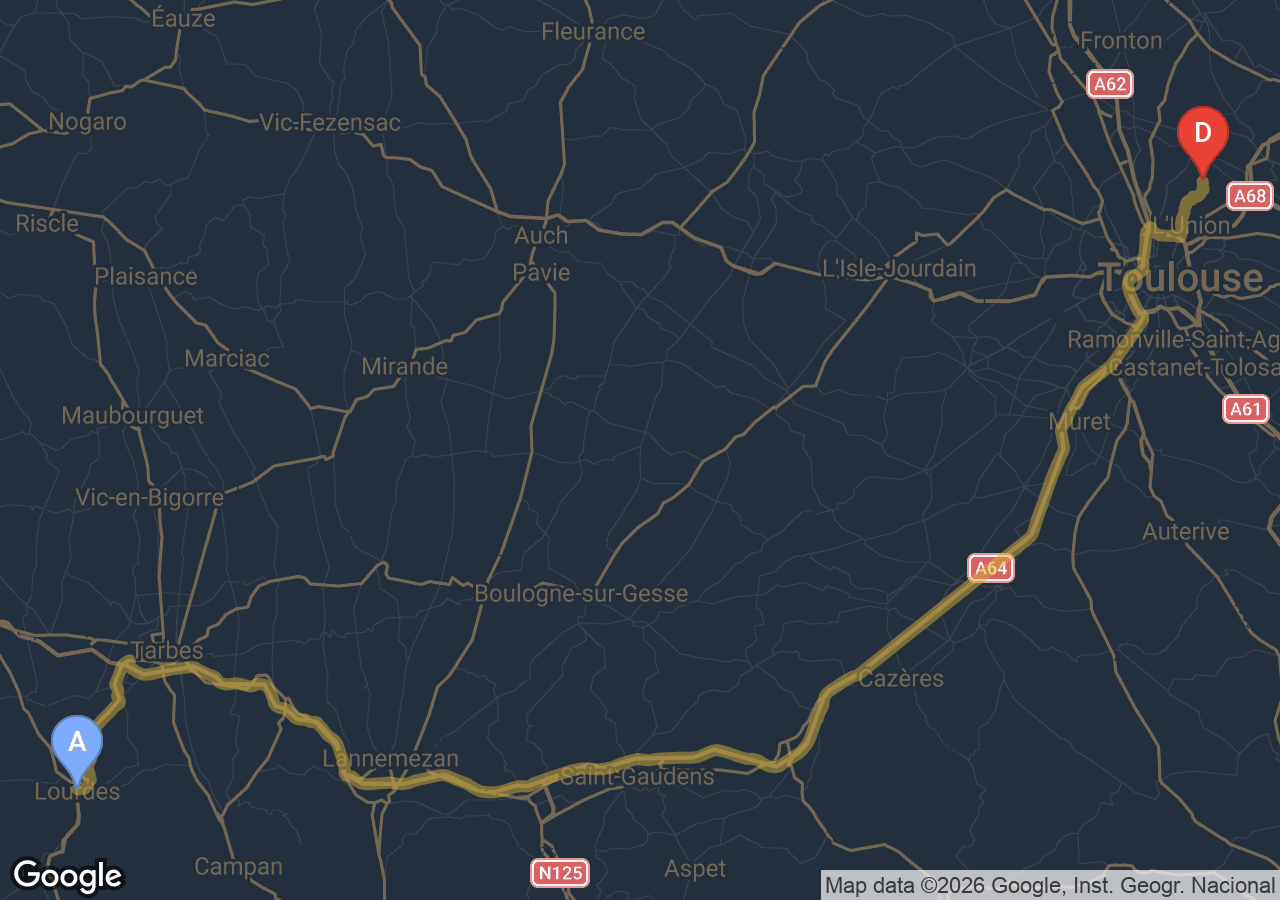 SSINT VTC assure votre trajet Castelmaurou → Lourdes en Tesla Model 3. Depuis Castelmaurou, commune de la banlieue toulousaine, la route emprunte la rocade et l'A64 pour 166 km en environ 1h40min. Tarif fixe incluant péage. Idéal pour Sanctuaire Notre-Dame ou gare de Lourdes.