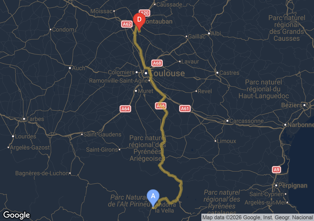 Trajets importants (Bordeaux, Carcassonne, Narbonne, Andorre...).