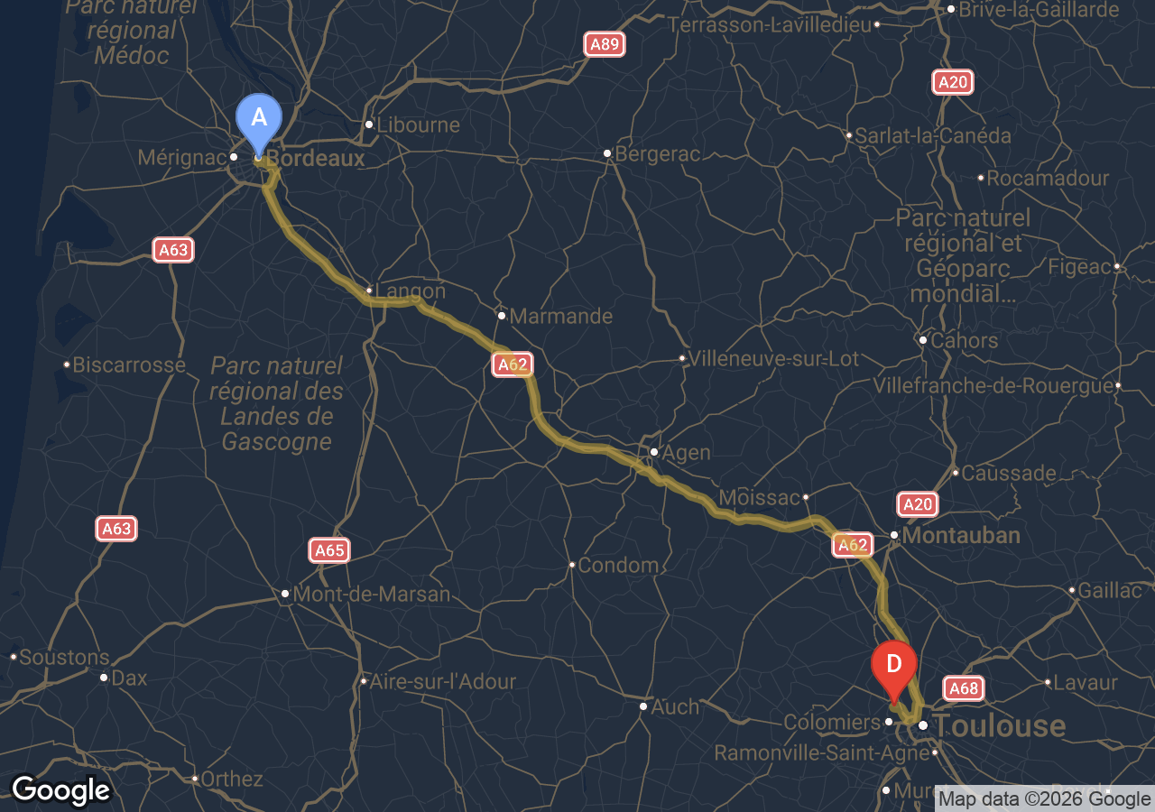 Environ 2h7min via la rocade et l'A62, hors trafic.