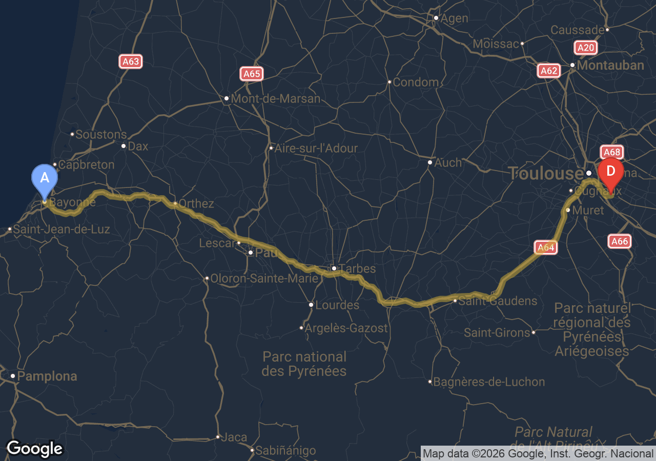 Environ 2h39min via la rocade et l'A64, hors trafic.