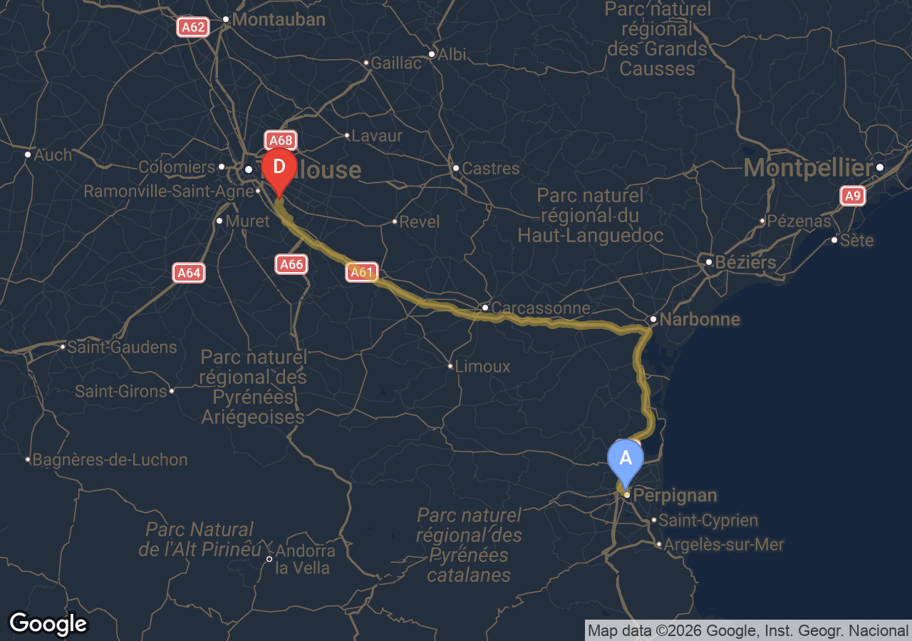 Estimé à 284 € TTC pour 166 km via la rocade, l'A61 et l'A9, péage A61/A9 inclus.