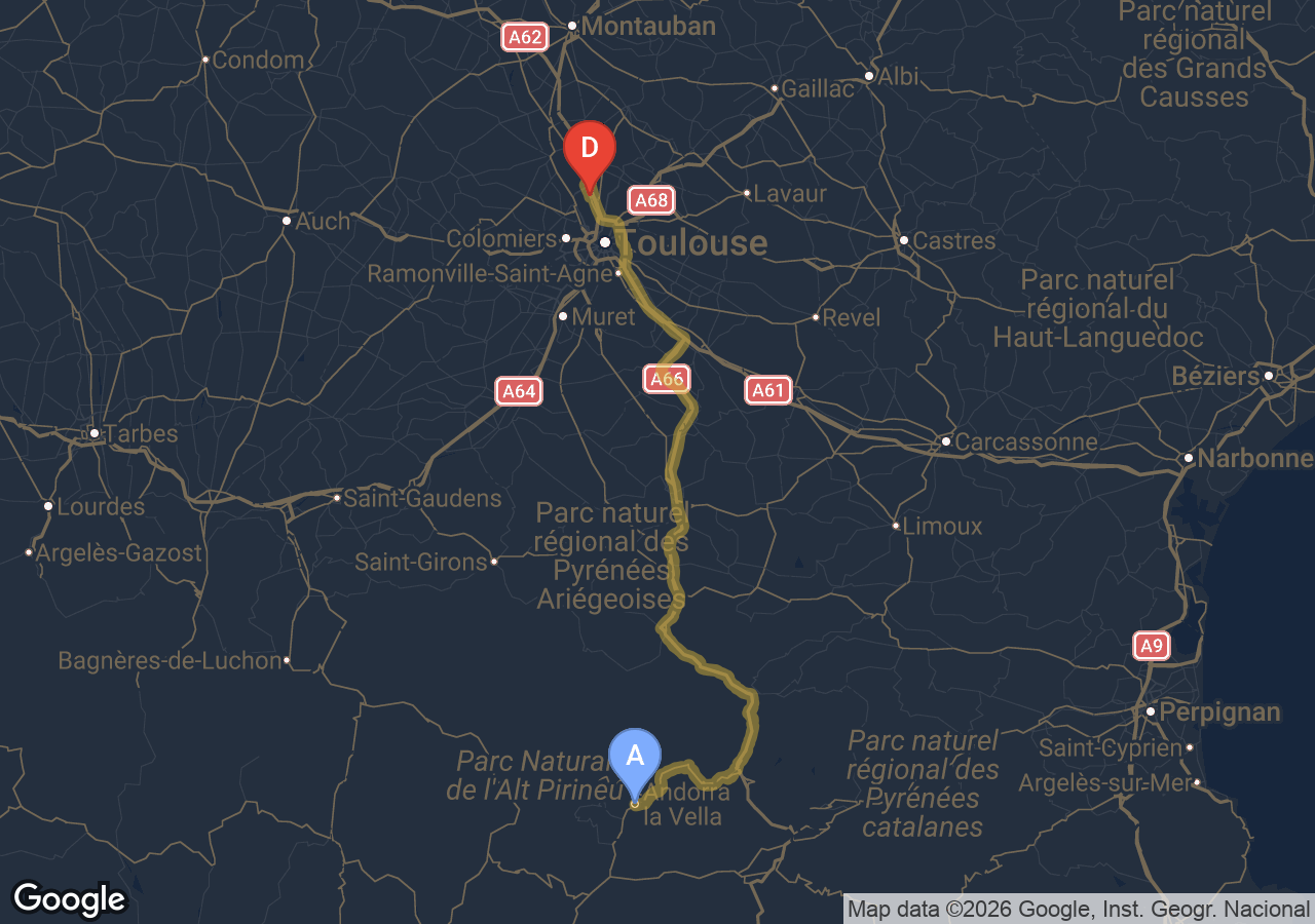 Trajets importants (Bordeaux, Carcassonne, Narbonne, Andorre...).