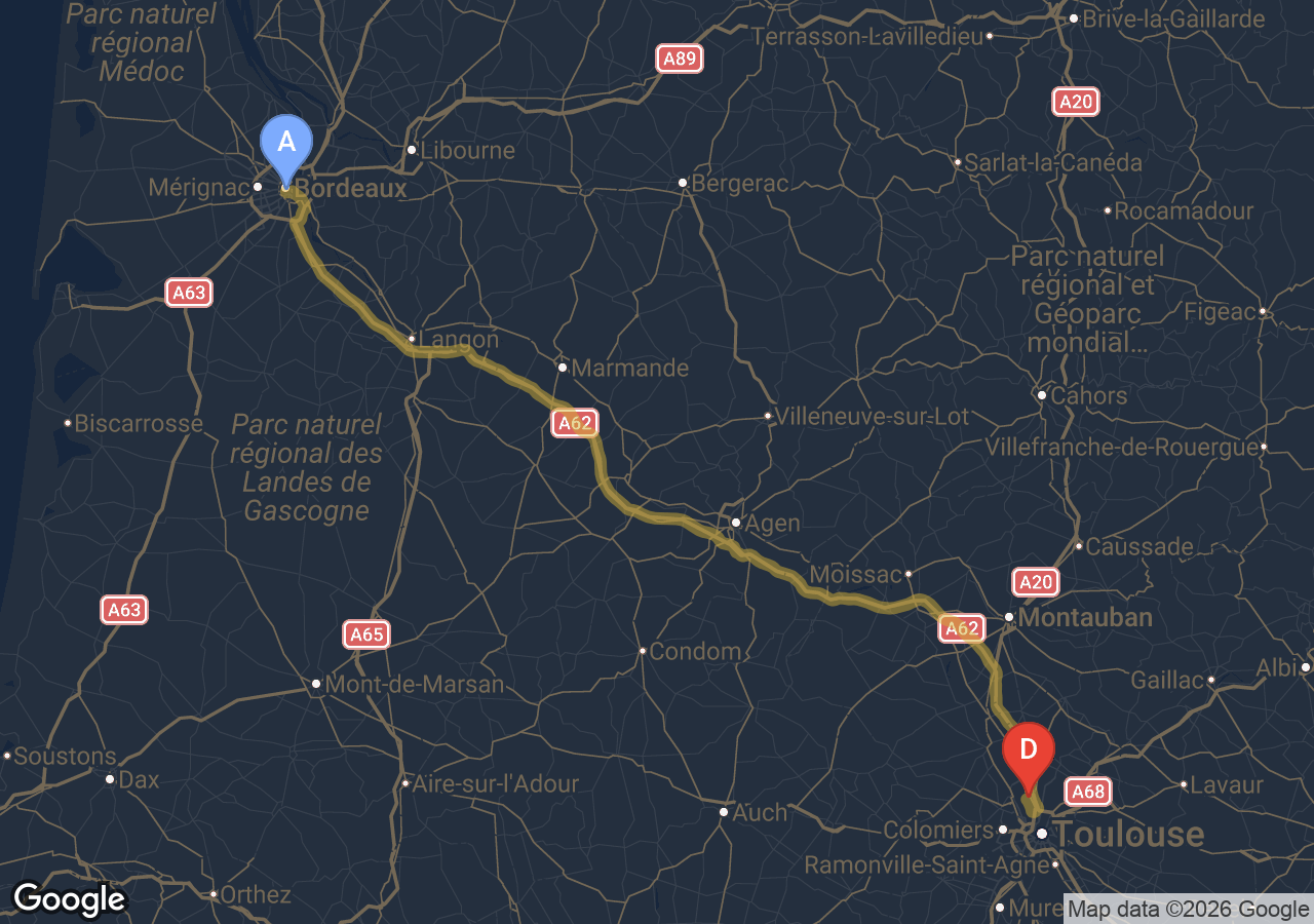 Environ 2h9min via la rocade et l'A62, hors trafic.
