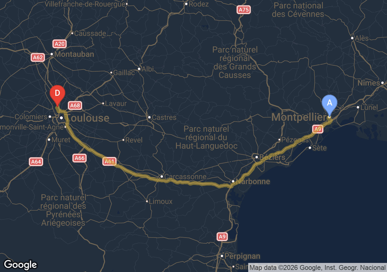 Trajets importants (Bordeaux, Carcassonne, Narbonne, Andorre...).