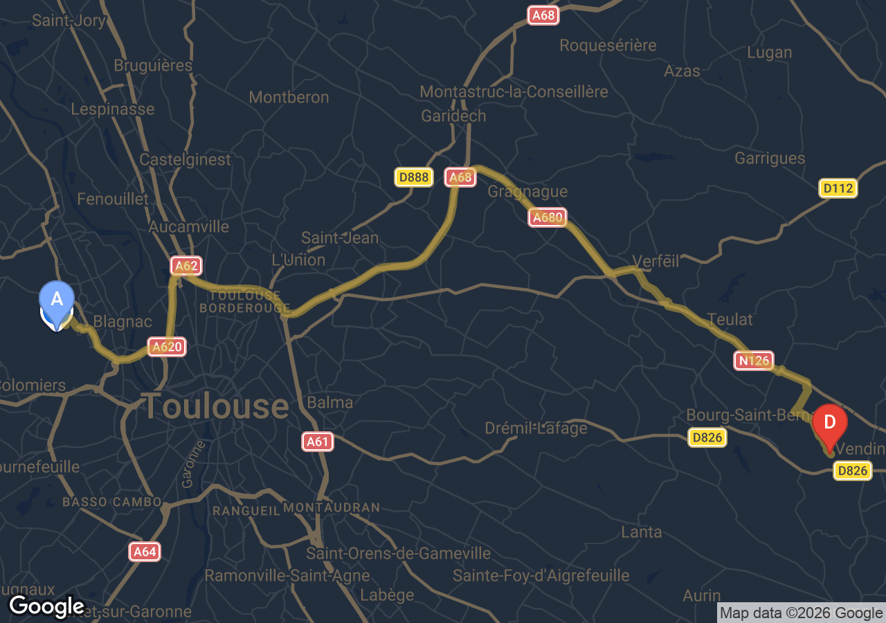 SSINT VTC assure votre transfert Francarville vers l'Aéroport Toulouse-Blagnac en Tesla Model 3, avec un tarif fixe annoncé à l'avance. Le trajet couvre 30 km en environ 40min selon les conditions de trafic. Péage autoroutier et frais de parking inclus — aucun supplément à l'arrivée. Je suis disponible dès 5h00, 7j/7, pour vos départs matinaux comme pour vos retours tardifs. Je suis votre vol en temps réel via FlightRadar24 et j'attends jusqu'à 30 minutes gratuitement si votre vol est retardé. La réservation se fait en ligne, par SMS ou WhatsApp. Je confirme ma disponibilité avec un tarif fixe garanti. Une facture est systématiquement fournie, idéale pour les notes de frais professionnelles. Je dessers Francarville et toutes les communes voisines de la métropole toulousaine.