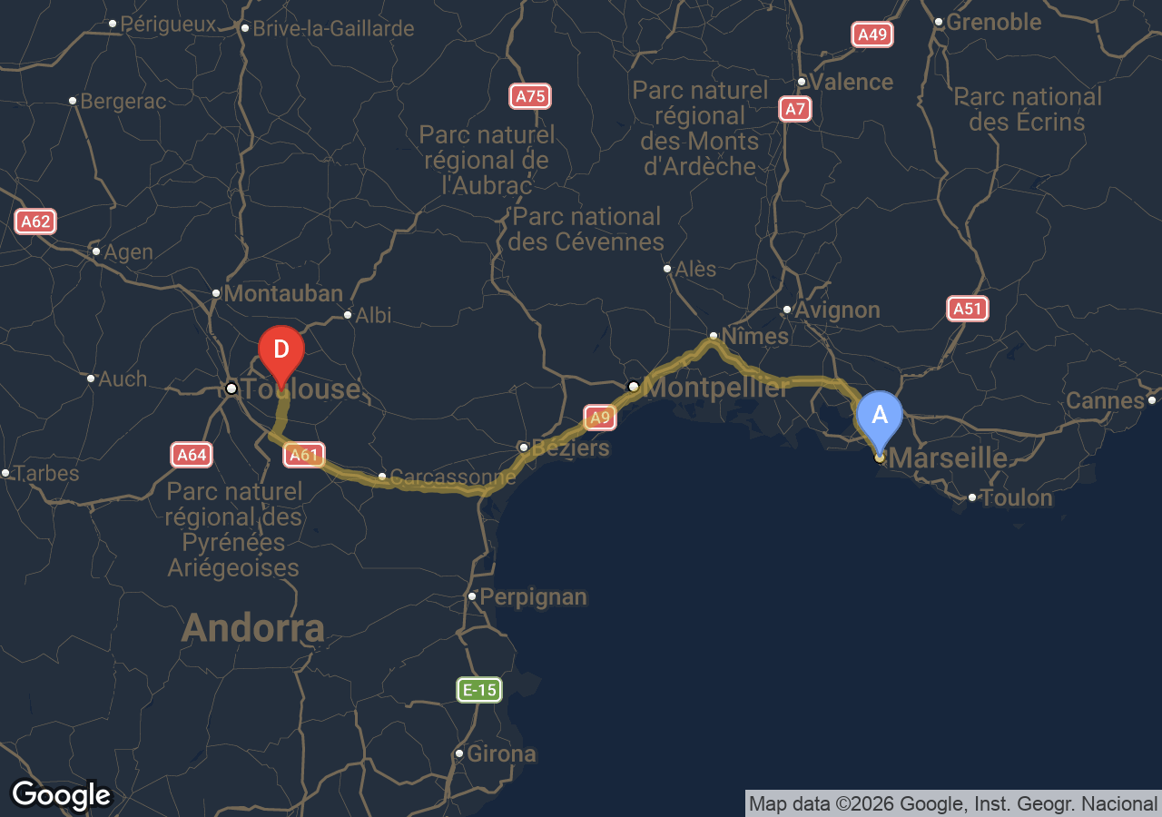 Trajets importants (Bordeaux, Carcassonne, Narbonne, Andorre...).