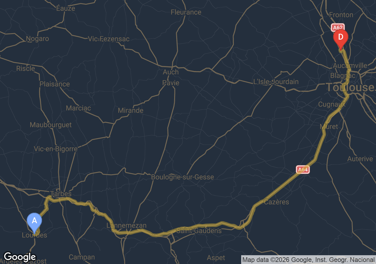 SSINT VTC assure votre trajet Gagnac-sur-Garonne → Lourdes en Tesla Model 3. Depuis Gagnac-sur-Garonne, commune de la banlieue toulousaine, la route emprunte la rocade et l'A64 pour 155 km en environ 1h33min. Tarif fixe incluant péage. Idéal pour Sanctuaire Notre-Dame ou gare de Lourdes.