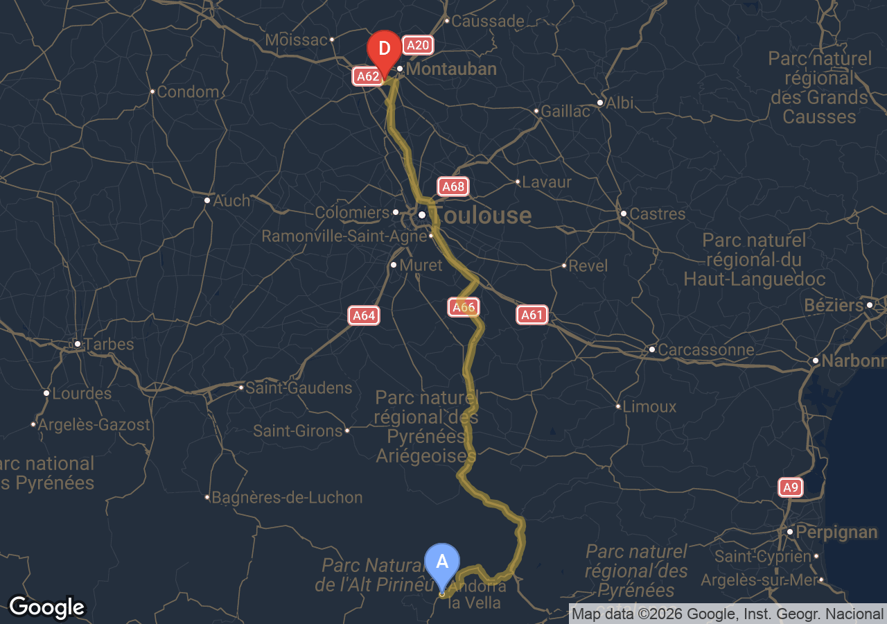 Le péage de l'A20 est inclus. La N20 (Ax-les-Thermes → Andorre) est gratuite.