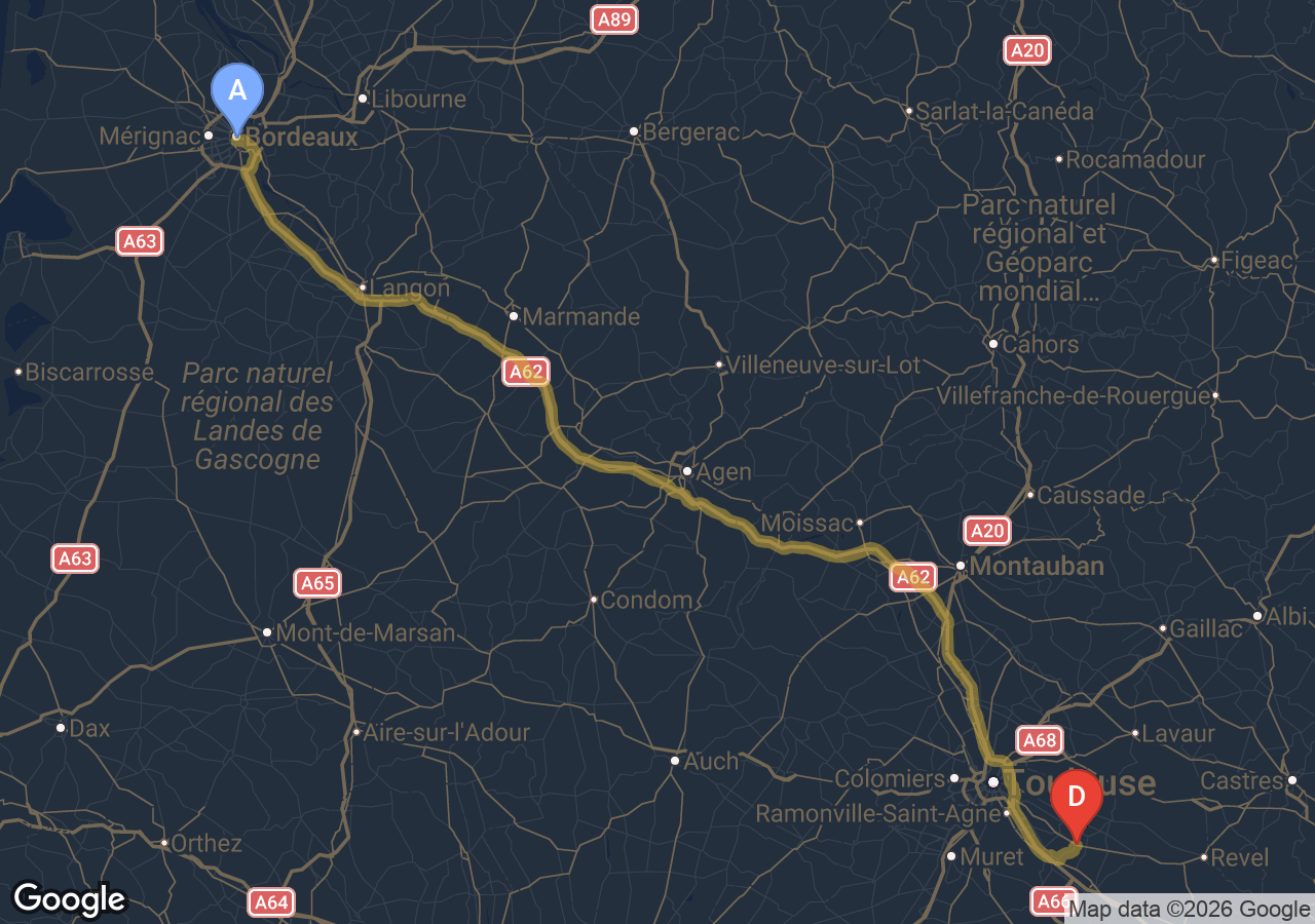 Environ 2h26min via la rocade et l'A62, hors trafic.