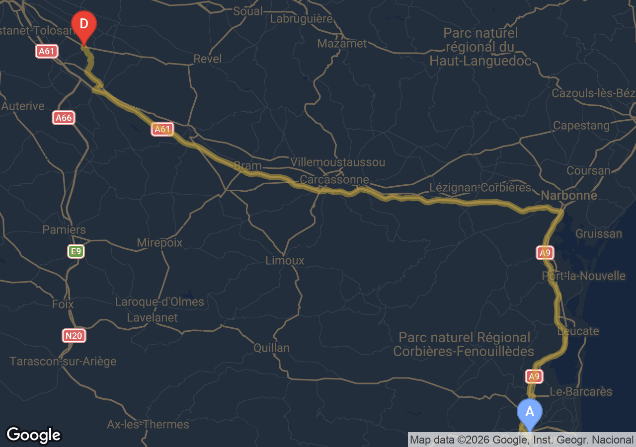 Trajets importants (Bordeaux, Carcassonne, Narbonne, Andorre...).