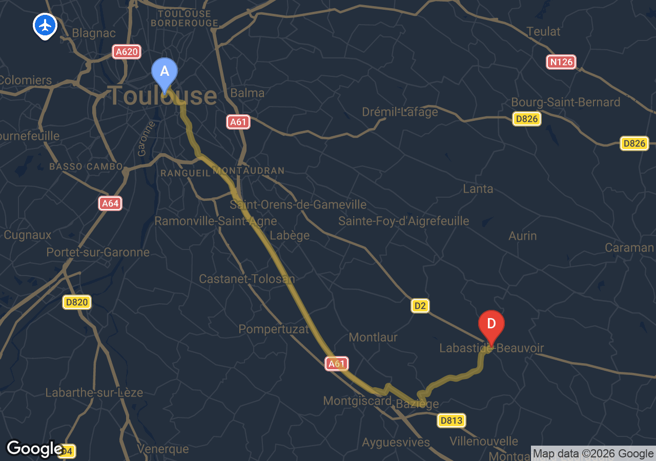 SSINT VTC assure votre trajet Labastide-Beauvoir → Toulouse en Tesla Model 3. Depuis Labastide-Beauvoir, commune de l'agglomération toulousaine élargie, la route rejoint Toulouse directement en 25 km et environ 38min. Tarif fixe confirmé avant départ. Idéal pour gare Matabiau, aéroport Blagnac ou Capitole.