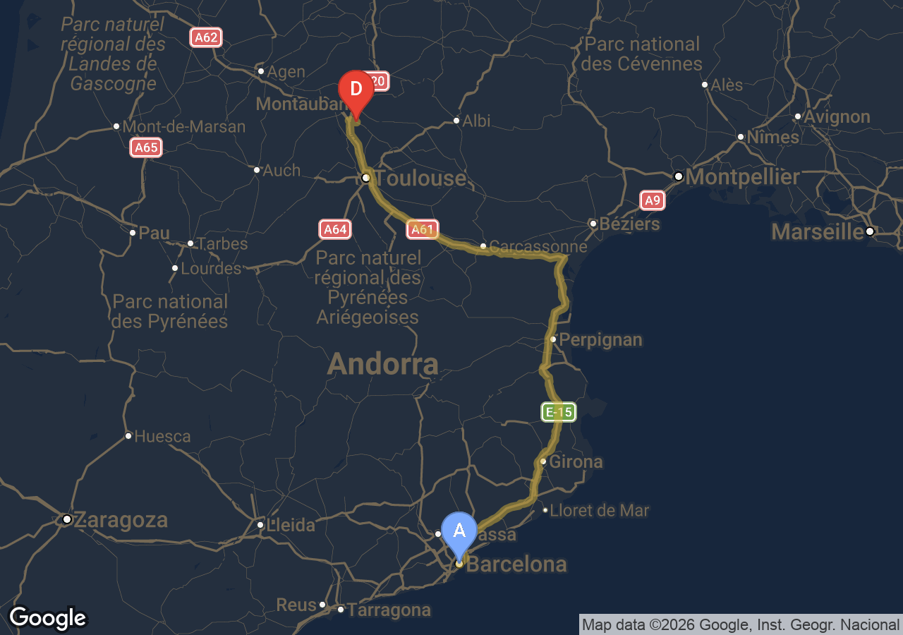 Trajets importants (Bordeaux, Carcassonne, Narbonne, Andorre...).
