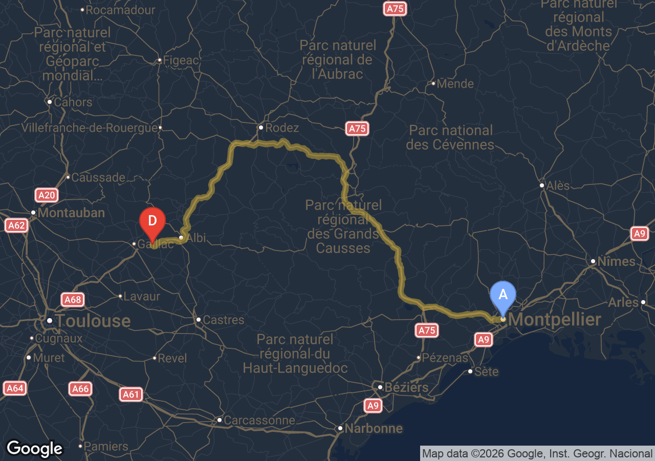 Trajets importants (Bordeaux, Carcassonne, Narbonne, Andorre...).