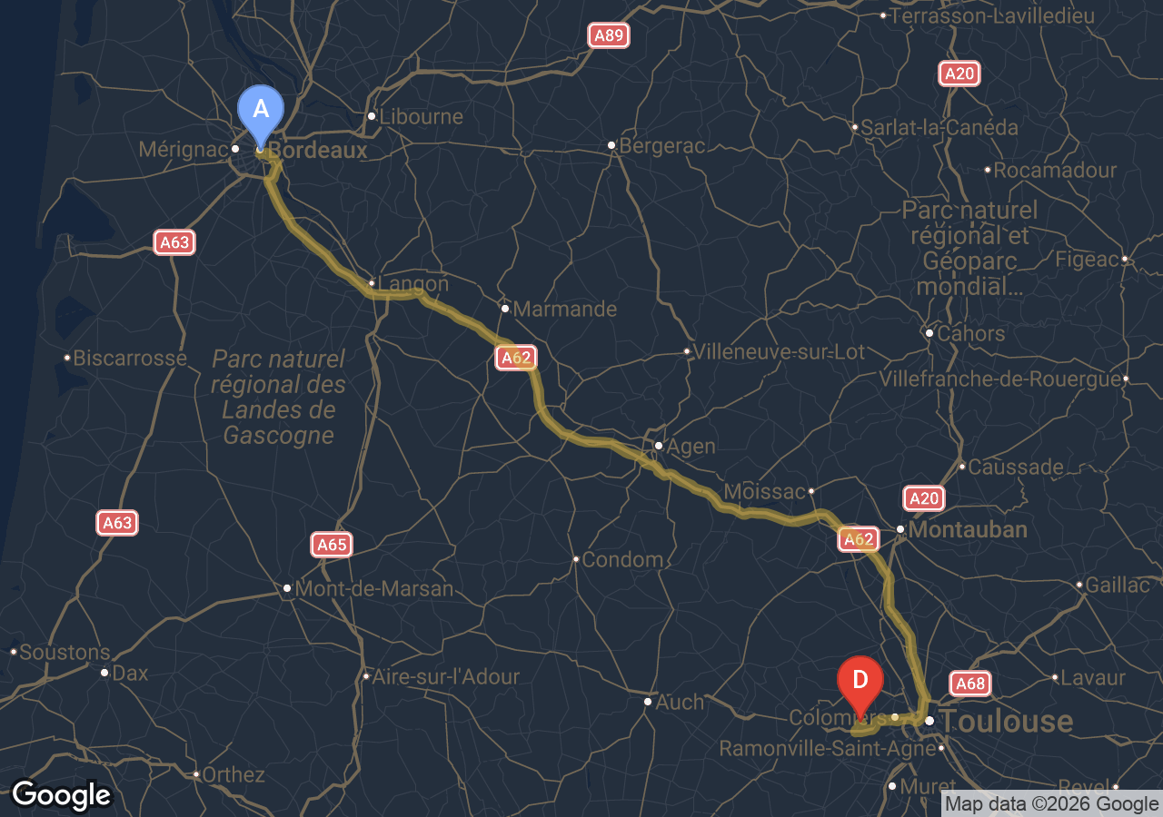 Environ 2h5min via la rocade et l'A62, hors trafic.