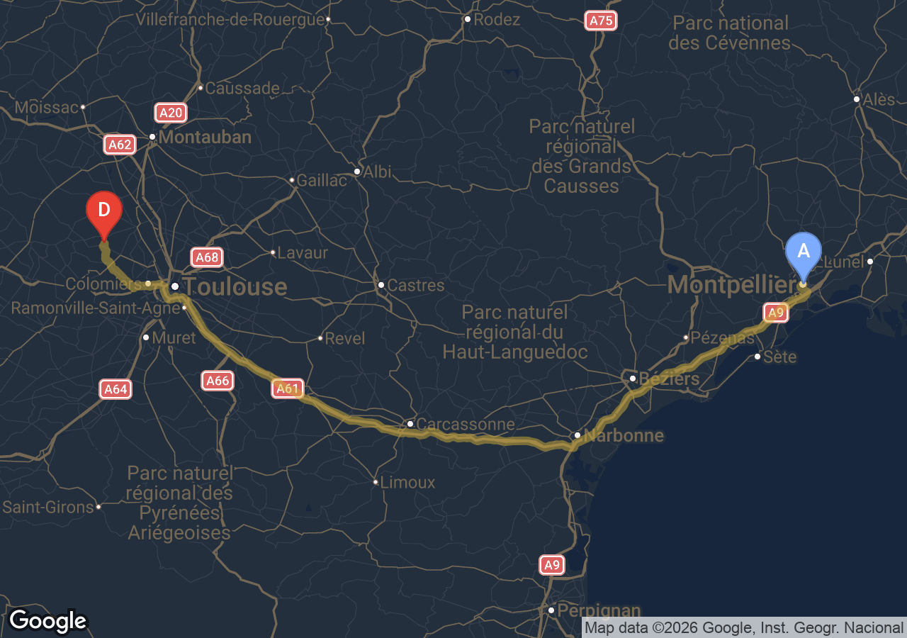 Trajets importants (Bordeaux, Carcassonne, Narbonne, Andorre...).
