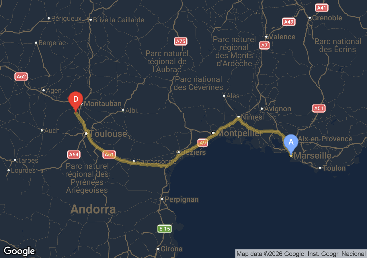 Trajets importants (Bordeaux, Carcassonne, Narbonne, Andorre...).