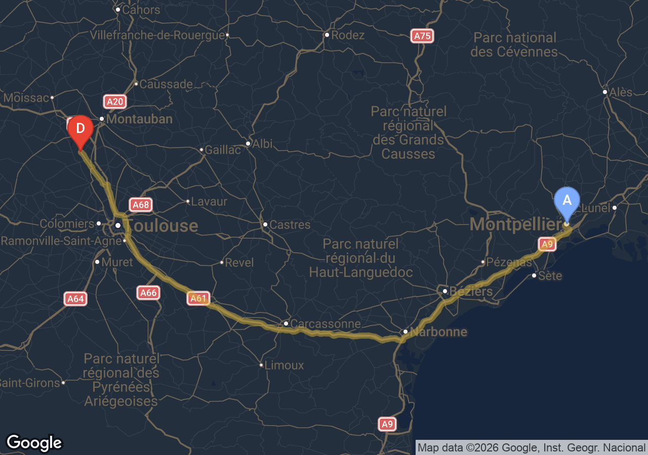 Estimé à 395 € TTC pour 232 km via la rocade, l'A61 et l'A9, péage A61/A9 inclus.