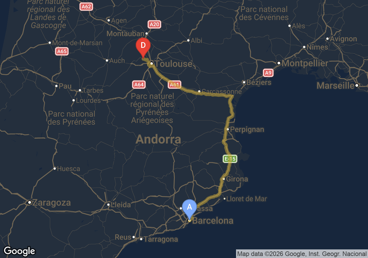 Trajets importants (Bordeaux, Carcassonne, Narbonne, Andorre...).