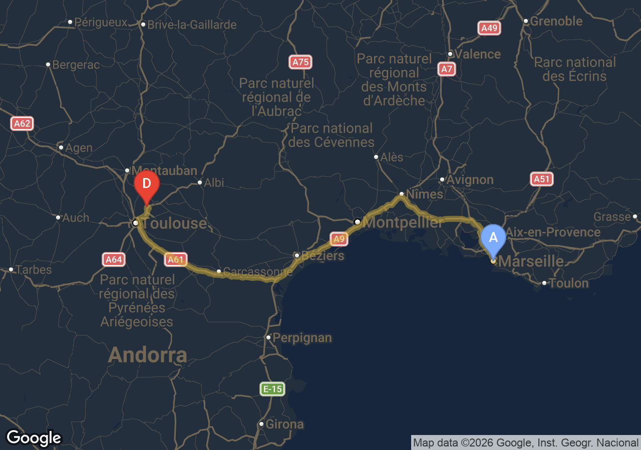 Trajets importants (Bordeaux, Carcassonne, Narbonne, Andorre...).