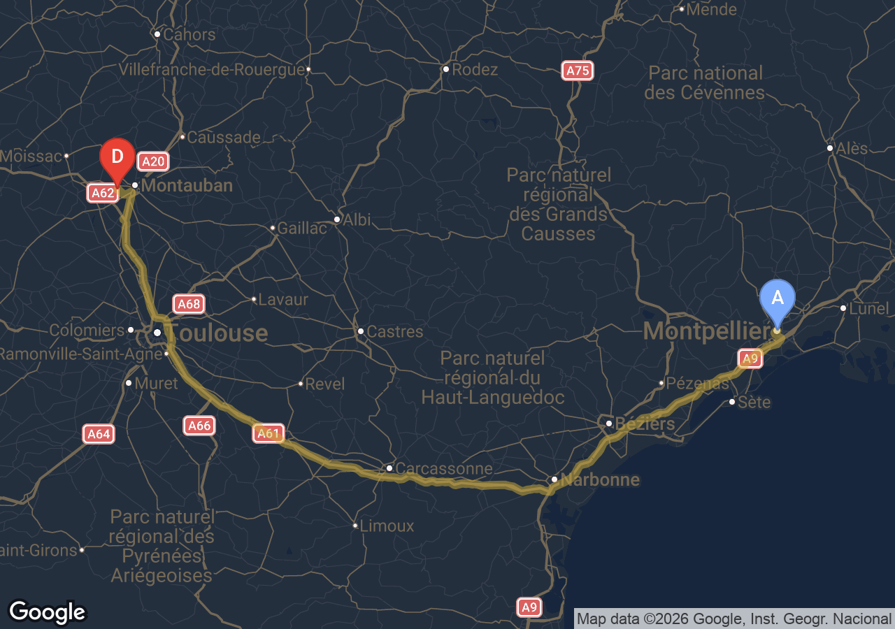 Trajets importants (Bordeaux, Carcassonne, Narbonne, Andorre...).