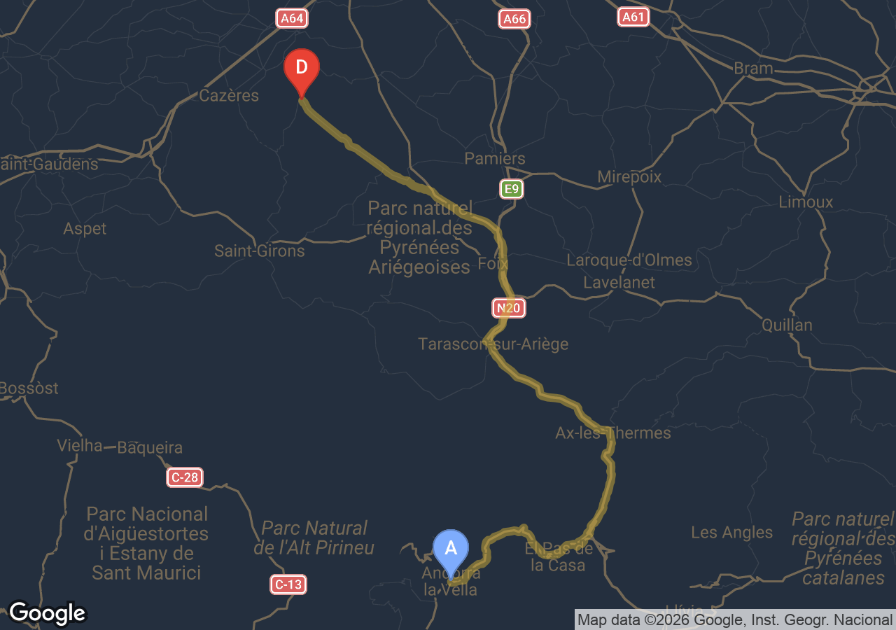 Le péage de l'A20 est inclus. La N20 (Ax-les-Thermes → Andorre) est gratuite.