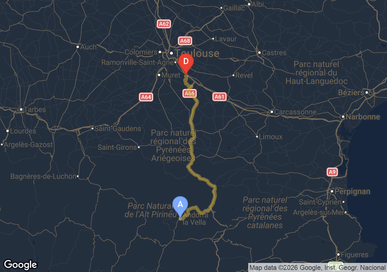 Trajets importants (Bordeaux, Carcassonne, Narbonne, Andorre...).