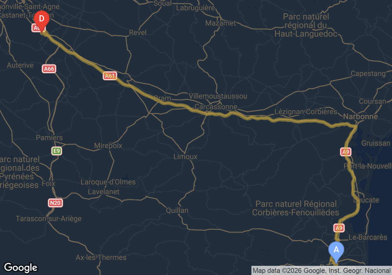 Trajets importants (Bordeaux, Carcassonne, Narbonne, Andorre...).