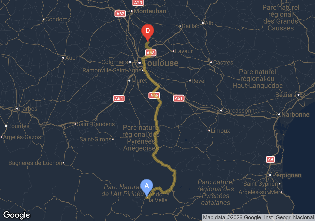 Trajets importants (Bordeaux, Carcassonne, Narbonne, Andorre...).