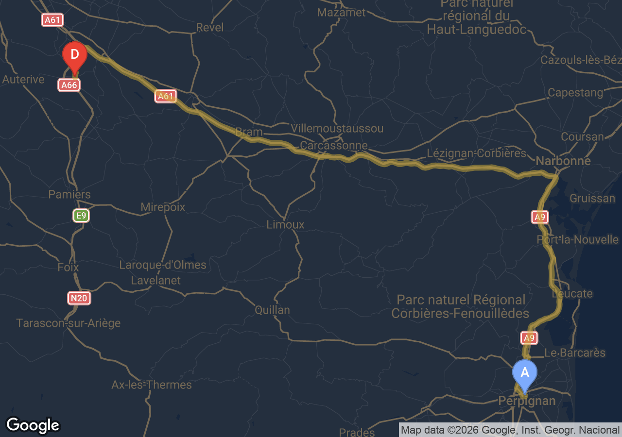 Trajets importants (Bordeaux, Carcassonne, Narbonne, Andorre...).