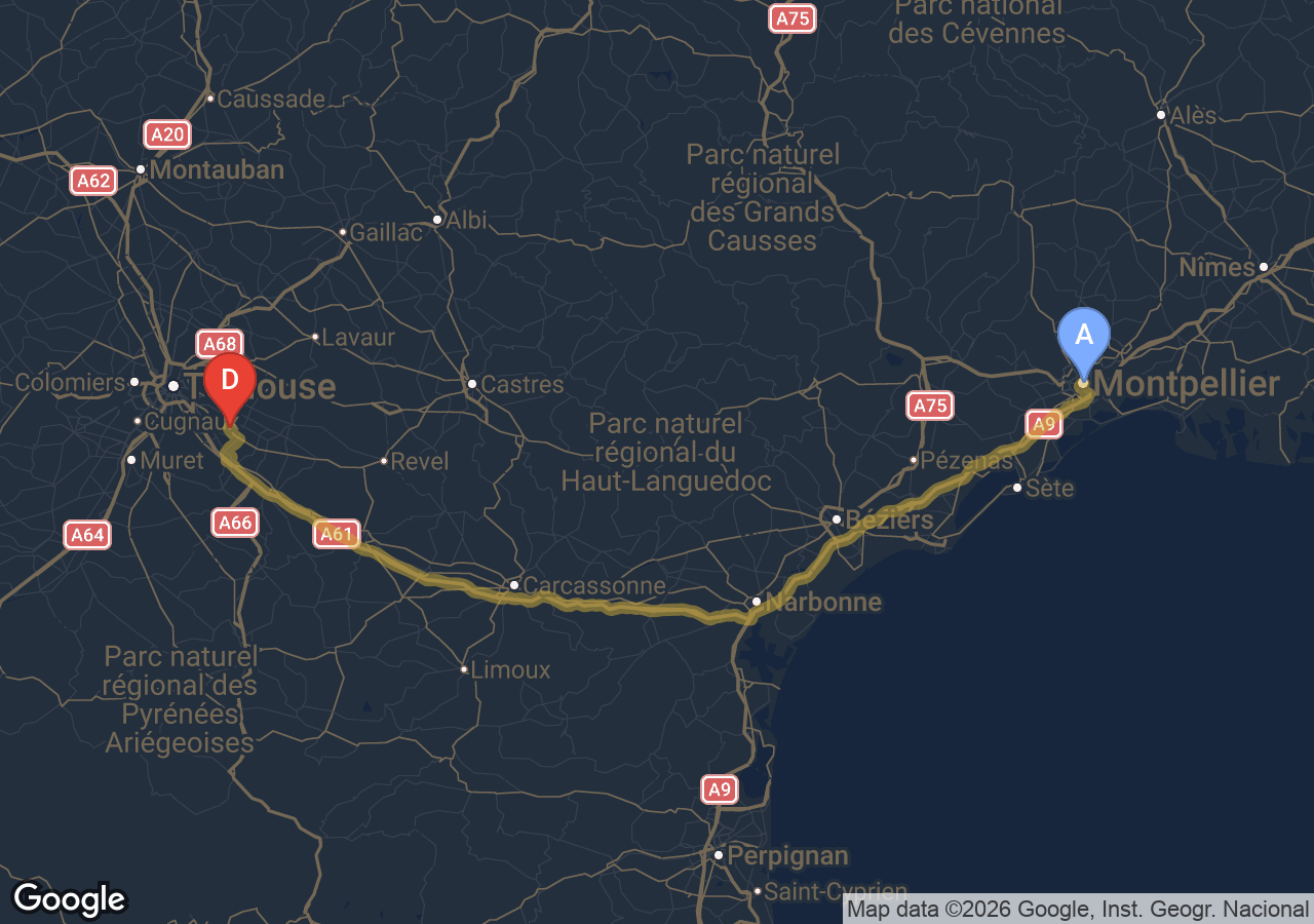 Estimé à 368 € TTC pour 216 km via la rocade, l'A61 et l'A9, péage A61/A9 inclus.