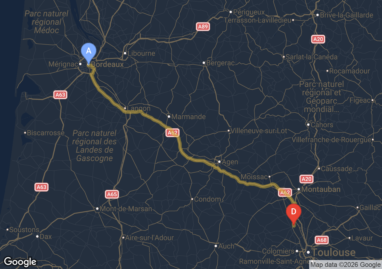Environ 1h57min via la rocade et l'A62, hors trafic.