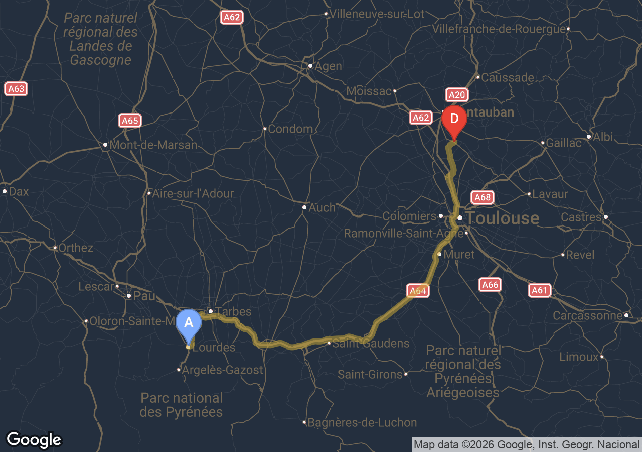Trajets importants (Bordeaux, Carcassonne, Narbonne, Andorre...).