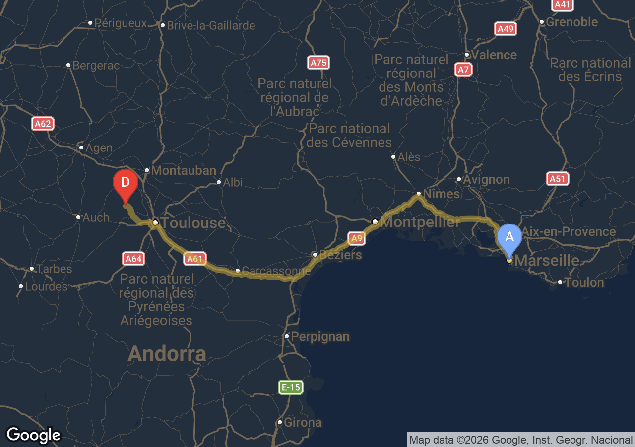 Trajets importants (Bordeaux, Carcassonne, Narbonne, Andorre...).
