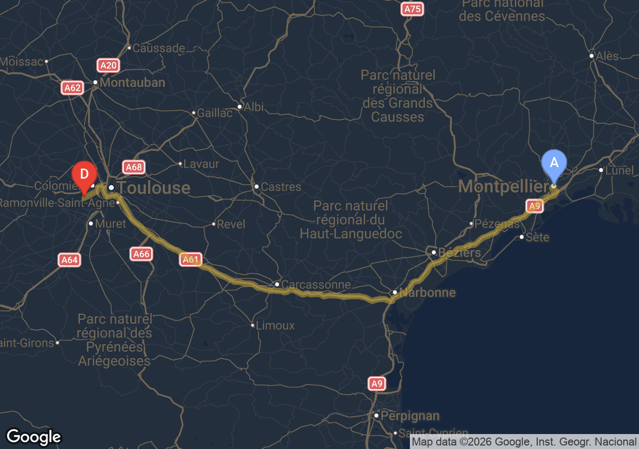 Trajets importants (Bordeaux, Carcassonne, Narbonne, Andorre...).
