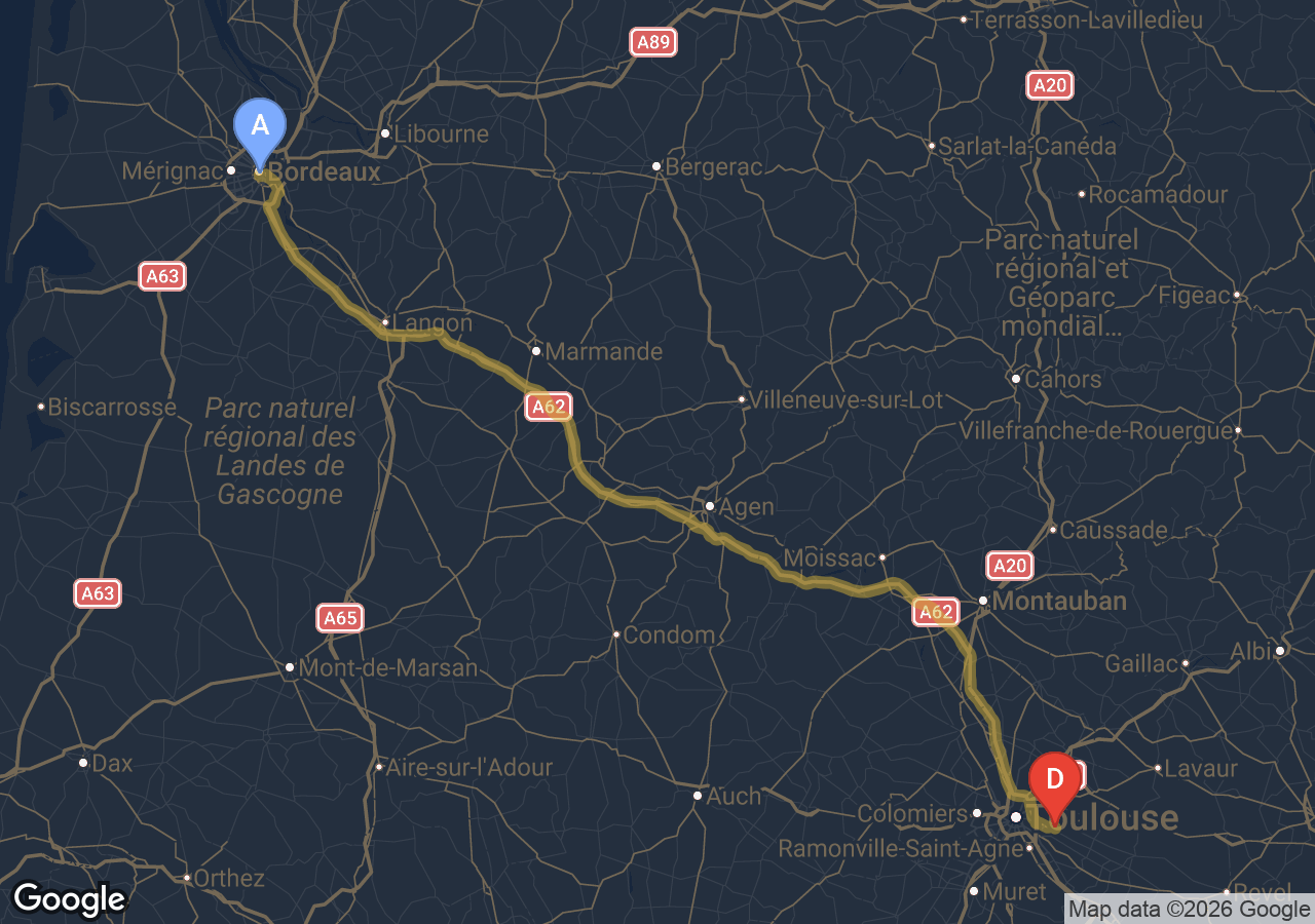 Environ 2h14min via la rocade et l'A62, hors trafic.
