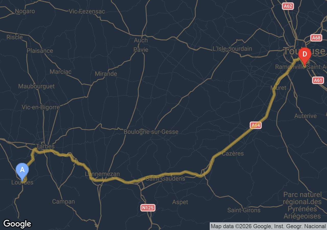Disponible 24 h/24, 7j/7 pour votre trajet Ramonville-Saint-Agne → Lourdes en toute sécurité et confort