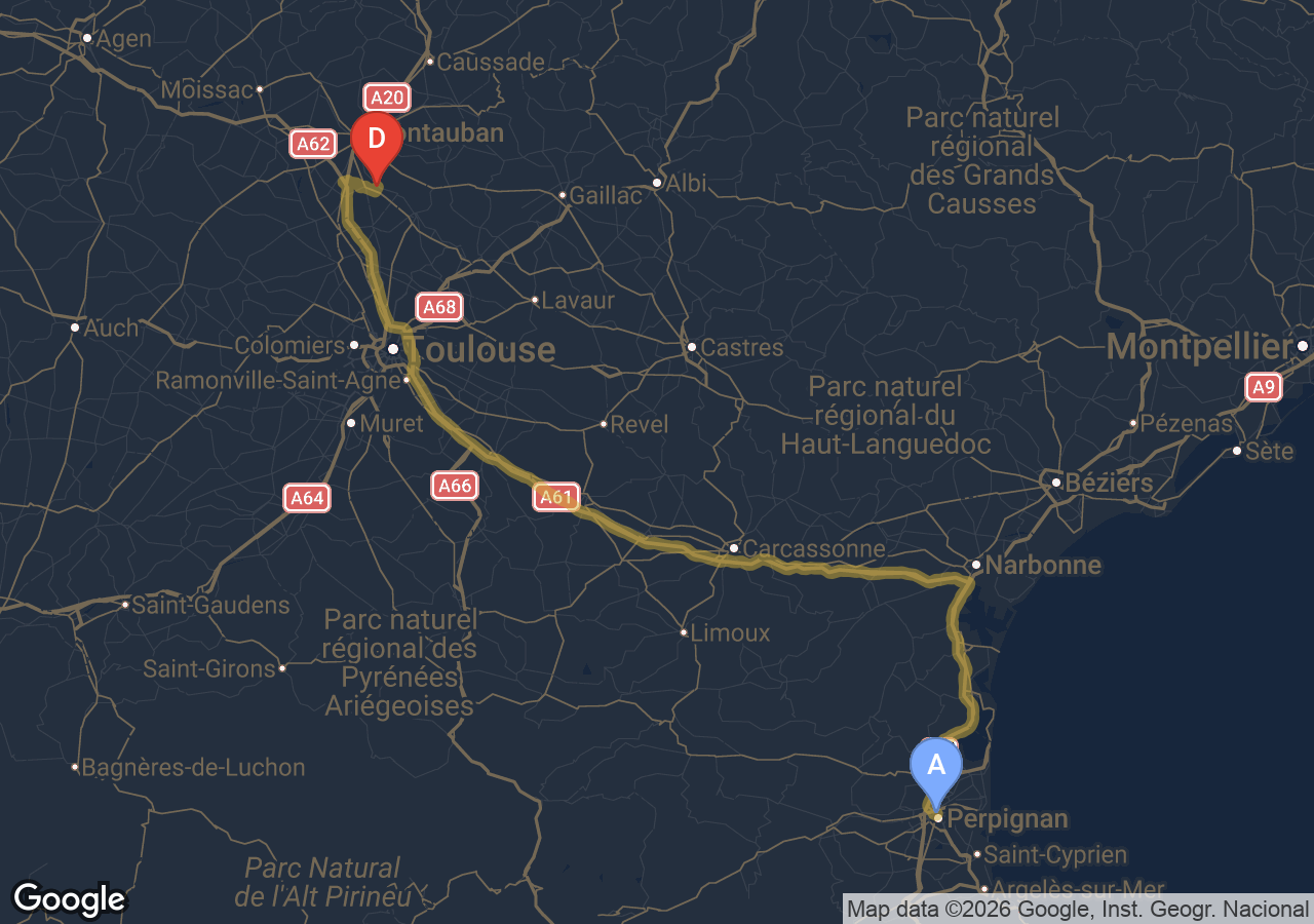 Estimé à 354 € TTC pour 208 km via la rocade, l'A61 et l'A9, péage A61/A9 inclus.