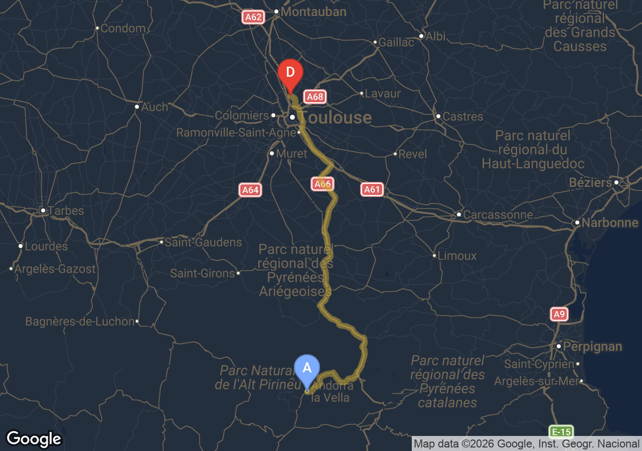 Le péage de l'A20 est inclus. La N20 (Ax-les-Thermes → Andorre) est gratuite.